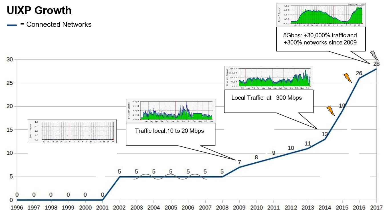 Over the years, the traffic carried, and the number of ISPs connecting to the UIXP has grown. There has also been an expansion in the types of peers to include content providers and academia. It is important to note that only five of the original directors of the ISPA are among the current 28 peers at the UIXP. The growth experienced by the UIXP has, however, constrained the facilities and resources available. The Commission has continuously supported the growth of UIXP by hosting and powering its technical infrastructure. The Commission has also provided space, security, power, switches, racks, server, and cooling requirements.