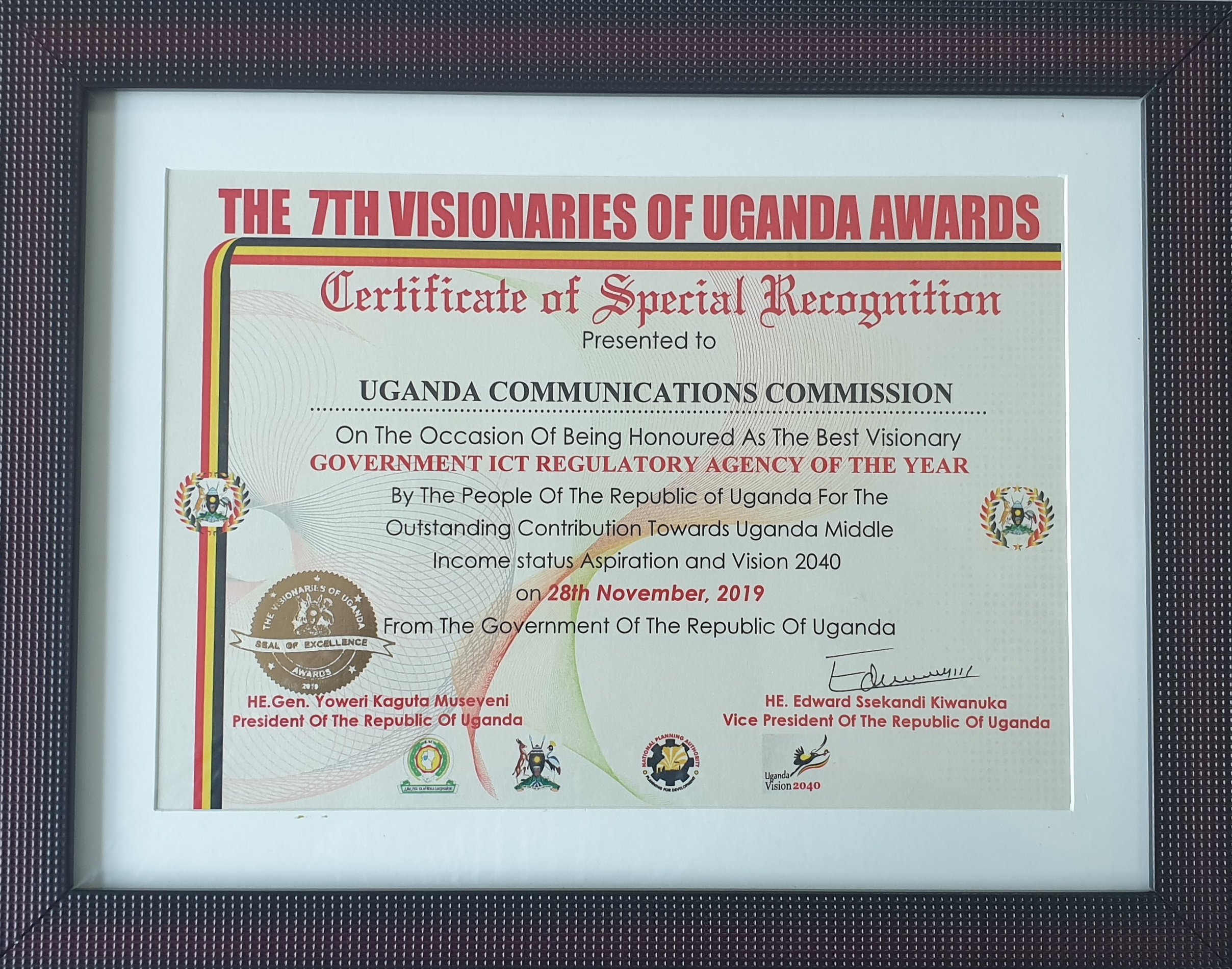 UCC was recognised during the 7th Visionaries of Uganda Awards held at the Kampala Serena Hotel on November 28. The event was presided over by H.E. the Vice President Edward Ssekandi and attended by the Minister of Finance, Planning and Economic Development Matia Kasaija, and the Minister of Public Service Muruli Mukasa, among other dignitaries.