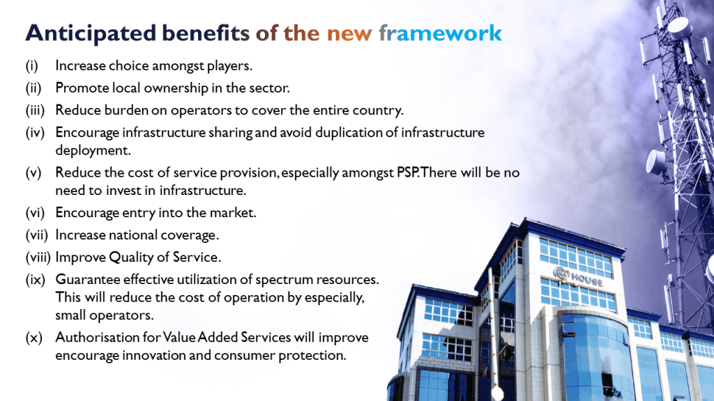 Having concluded a review of the new licensing framework for the telecommunications sector and approved various license categories, the Commission recently wrote to concerned telecom operators and service providers confirming the new terms and reminding them to submit their expression of interest within the stipulated timelines.