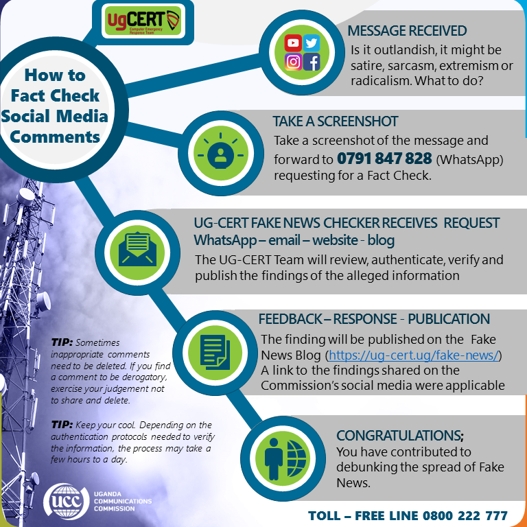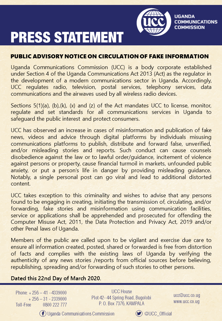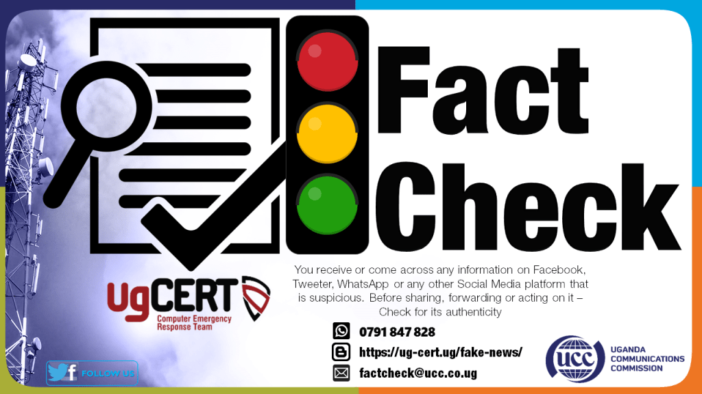 Therefore, the public is advised to be vigilant and to exercise due diligence by verifying the authenticity of any news stories or reports from unofficial sources before believing and acting on them. A request to check a piece of information can be sent to 0791 847 828 (Whatsapp); Email: factcheck@ucc.co.ug; Blog: https://ug-cert.ug/fake-news/ for verification and fact-checking.