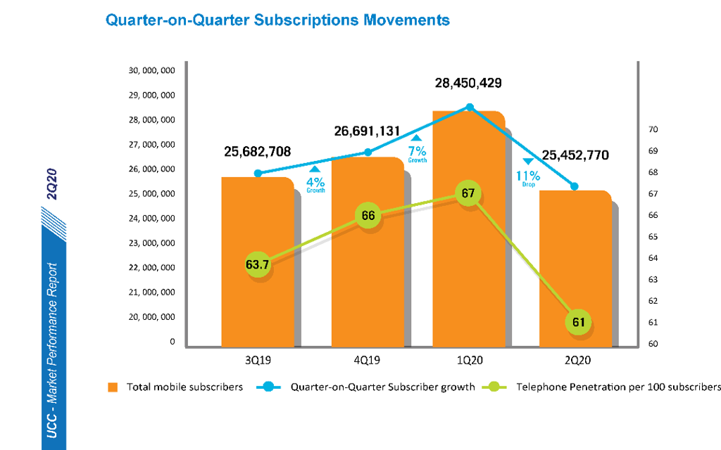 The report indicates that mobile subscriptions dropped from 28.4 million at the end of March to 25.5 million at the end of June 2020.