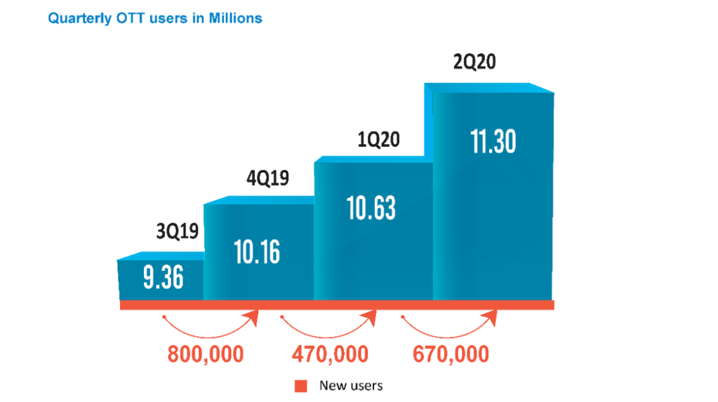 There was also 7% growth for OTT subscriptions, which increased by 700,000 cellular users, up from 10.6 million users in March 2020. This refers to users who accessed OTT services (such as Facebook, WhatsApp, Twitter and Zoom) at least once in the month of June 2020.