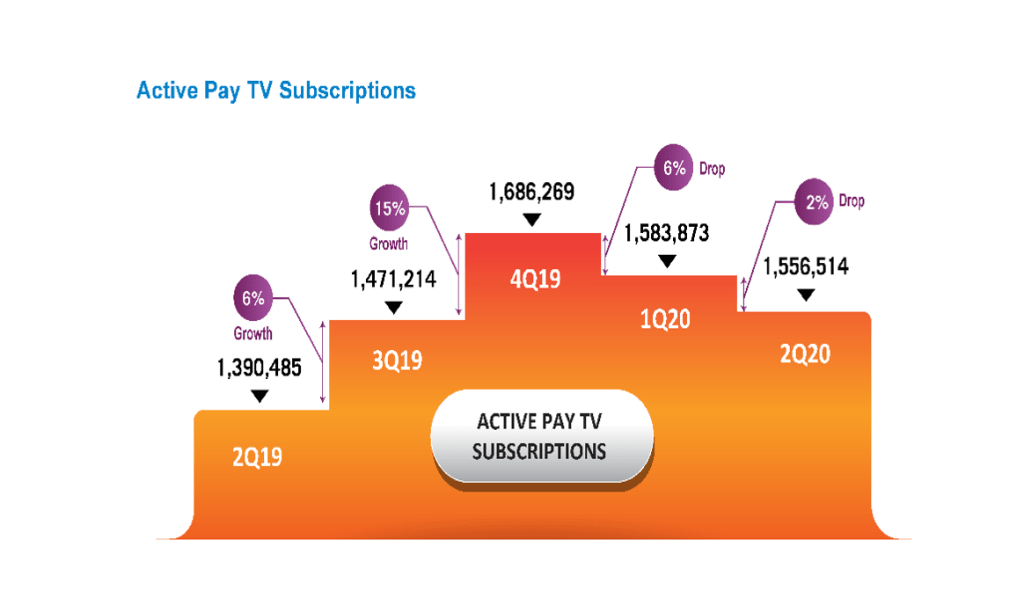 As for pay-TV, total active subscribers dropped from 1.58 million in the previous quarter to 1.56 million in the quarter under review, representing a market contraction of 2%.