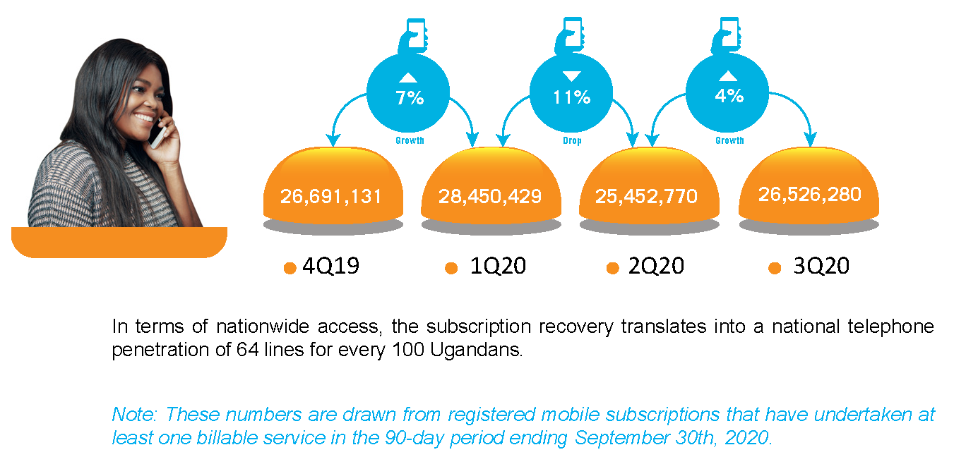 The current subscription figure translates into a national telephone penetration of 64 lines for every 100 Ugandans.