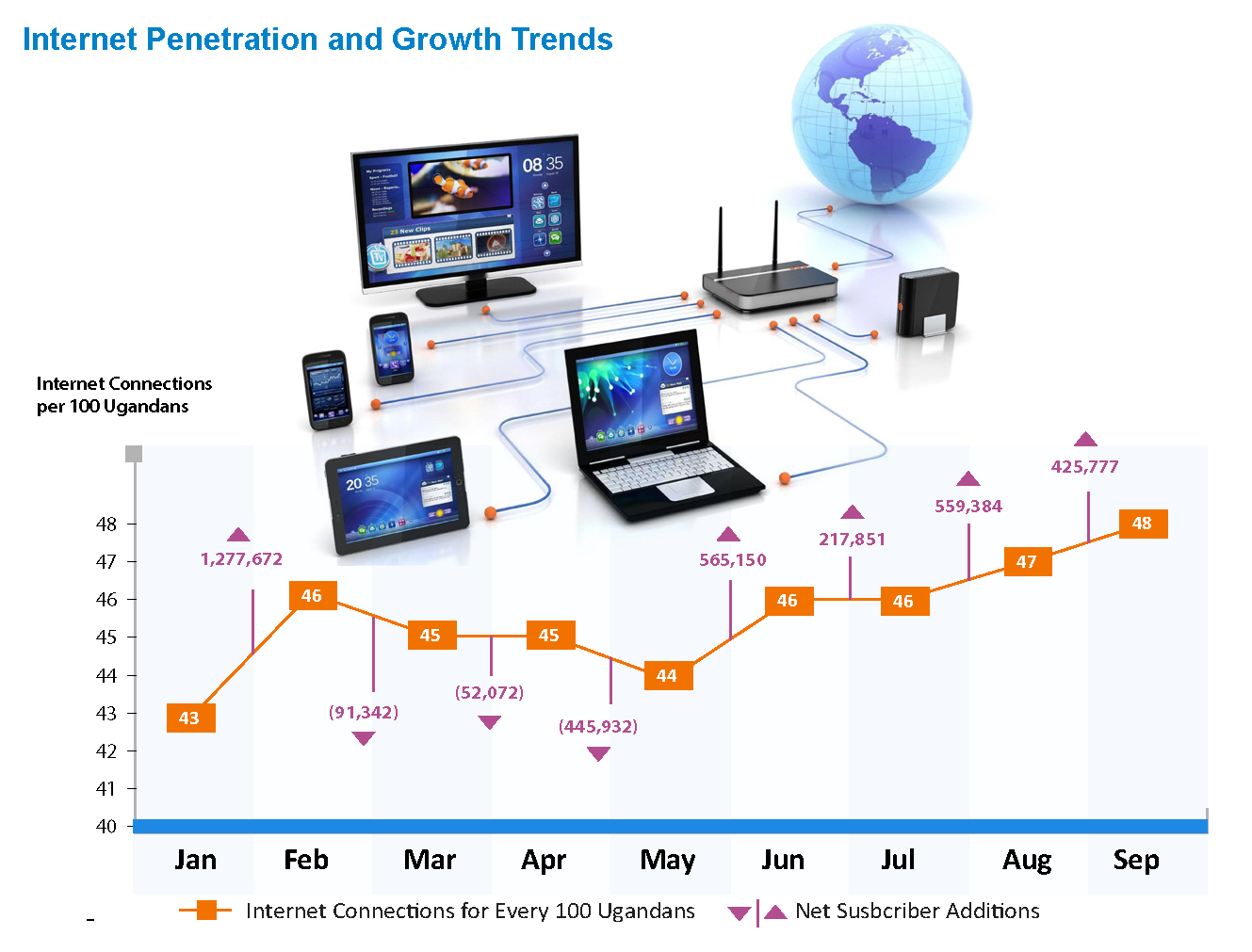 At 20 million Internet subscriptions, nearly 50% of the Ugandan population is connected to broadband, the latest communications Market Performance Report indicates.