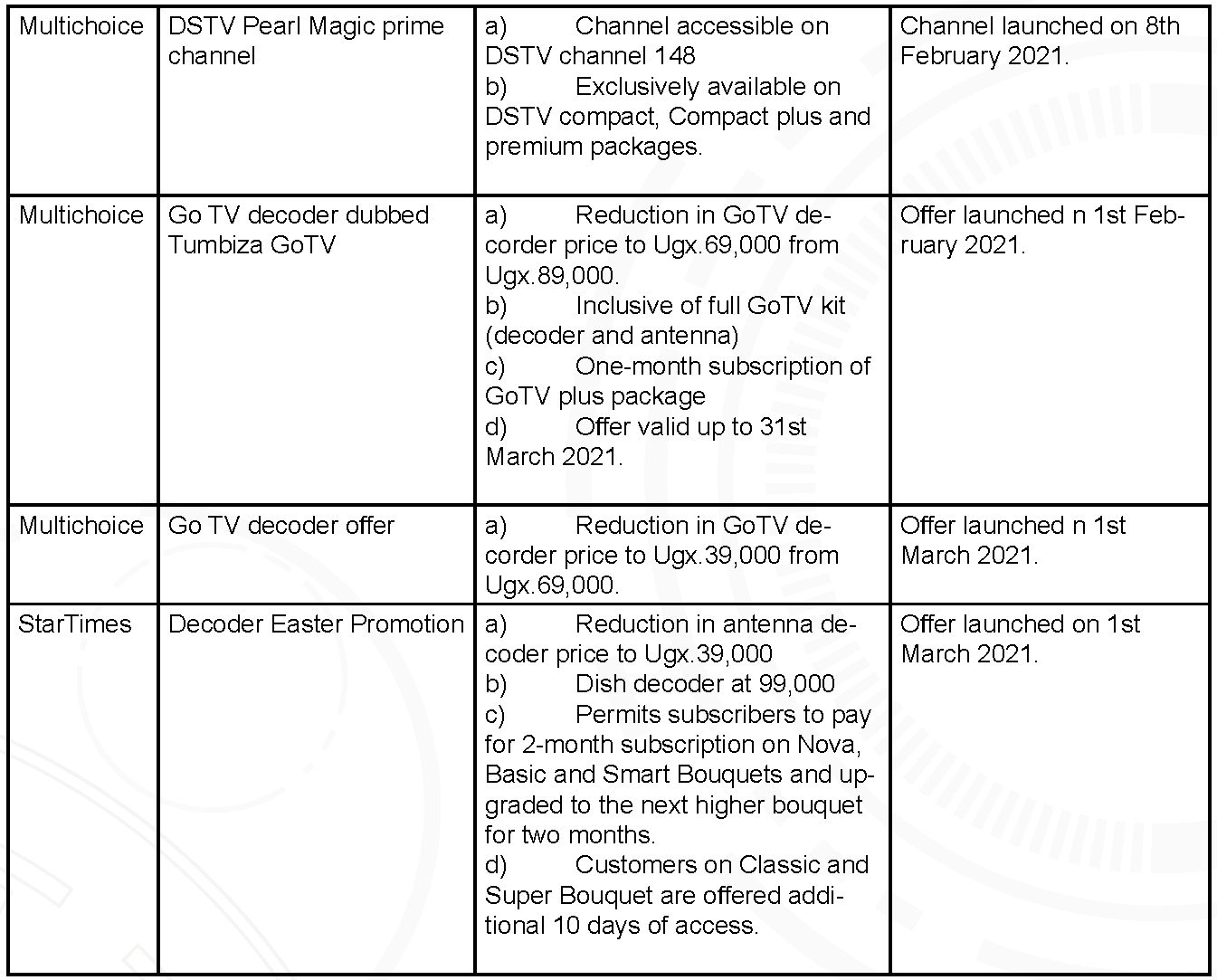 In the mobile network space, the highlight of the quarter was the award of the third National Telecom Operator license to Tangerine Ltd, trading as LycaMobile Uganda, on 24th March 2021. The provisional license permits LycaMobile to deploy national telecommunications infrastructure and provide licensed telecommunications services across all the regional license zones defined by the licensor.