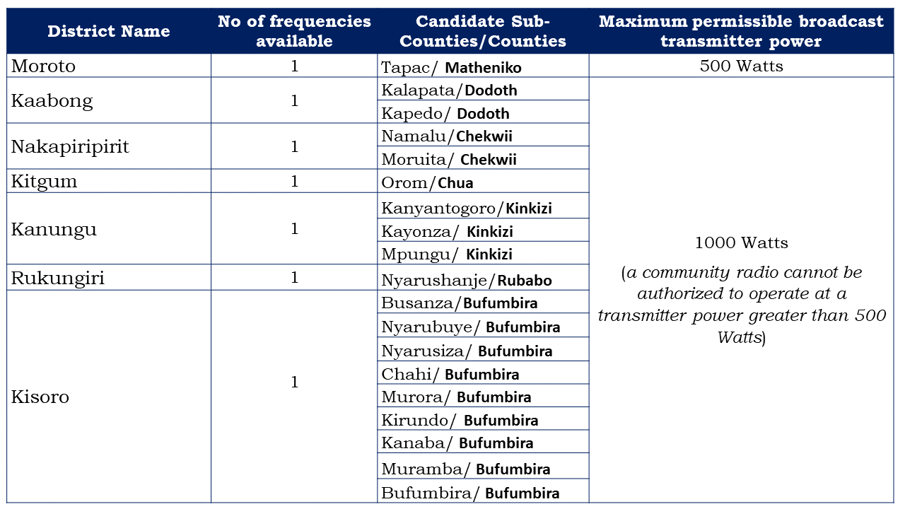 In the quest to improve access to radio broadcasting services across Uganda, the Commission invites applications for spectrum reservation towards the grant of a broadcasting licence and radio frequency spectrum authorization for an FM broadcasting station in the areas below. Please note that the successful applications in each area shall be selected through a competitive process.