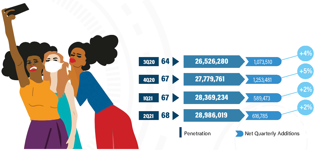 The growth in internet penetration mirrors related growth in total MBs downloaded, which jumped by 19% from 58.3 million at the end of March to 69.3 million at the end of June 2021.