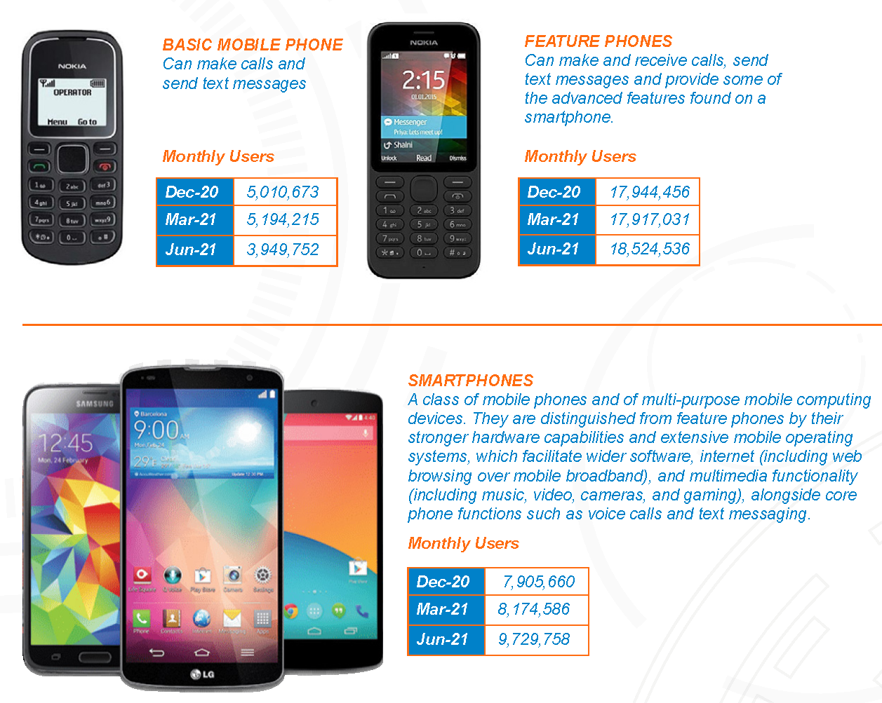 More than 30% of the new terminals were internet-enabled gadgets, while 70% were basic and feature phones. According to the report, by the end of June 2021, the total number of connected smartphones or internet-enabled gadgets stood at 9.7 million, while feature phones and basic phones were 22.4 million.