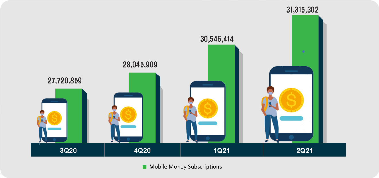 | Registered Mobile Money Subscriptions | 30,546,414 | 31,307,427 | 2% |