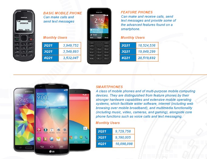 As basic mobile phones reduced from 3,949,752 in June 2021 to 3,532,047 in December 2021, feature phones increased from 18,524,536 to 20,519,692 during the same period. Like feature phones, smart phones increased too, from 9,729,758 in June 2021 to 10,098,098 in December 2021.