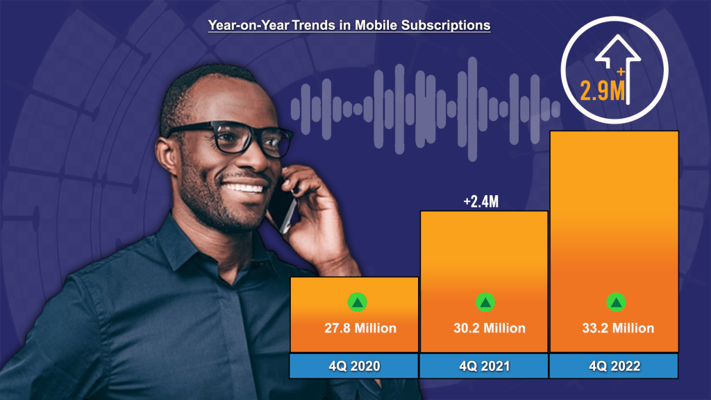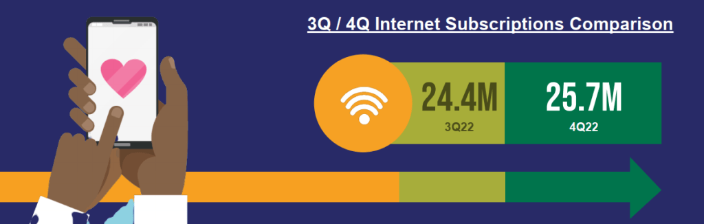 On the other hand, total internet subscriptions crossed the 25 million mark with a net addition of 1.3 million subscriptions in the quarter, and the highest quarter-on-quarter addition in 2022. The growth in internet subscriptions was driven by the seasonal factor associated with internet packages and value propositions offered by the various Internet Service Providers (ISPs) during the end-of-year festivities. Going by a year-on-year comparison, some 1.8 million new internet connections were recorded, resulting in a national penetration rate of 60%.
