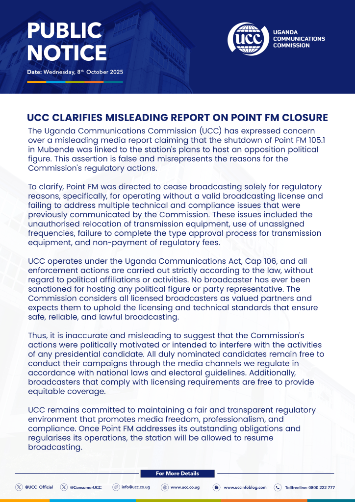 The Uganda Communications Commission (UCC) was established under the legal framework of the Uganda Communications Act No. 1 of 1997 and the Electronic Media Act of 1996. Consequently, UCC operates as an integrated regulatory body overseeing various sectors, including Telecommunications, Data Communications, Broadcasting, Postal Communication, Radio Communication, and Infrastructure services throughout Uganda. It is also tasked with the responsibility of licensing operations of cinematography theatres and video or film libraries in Uganda.
